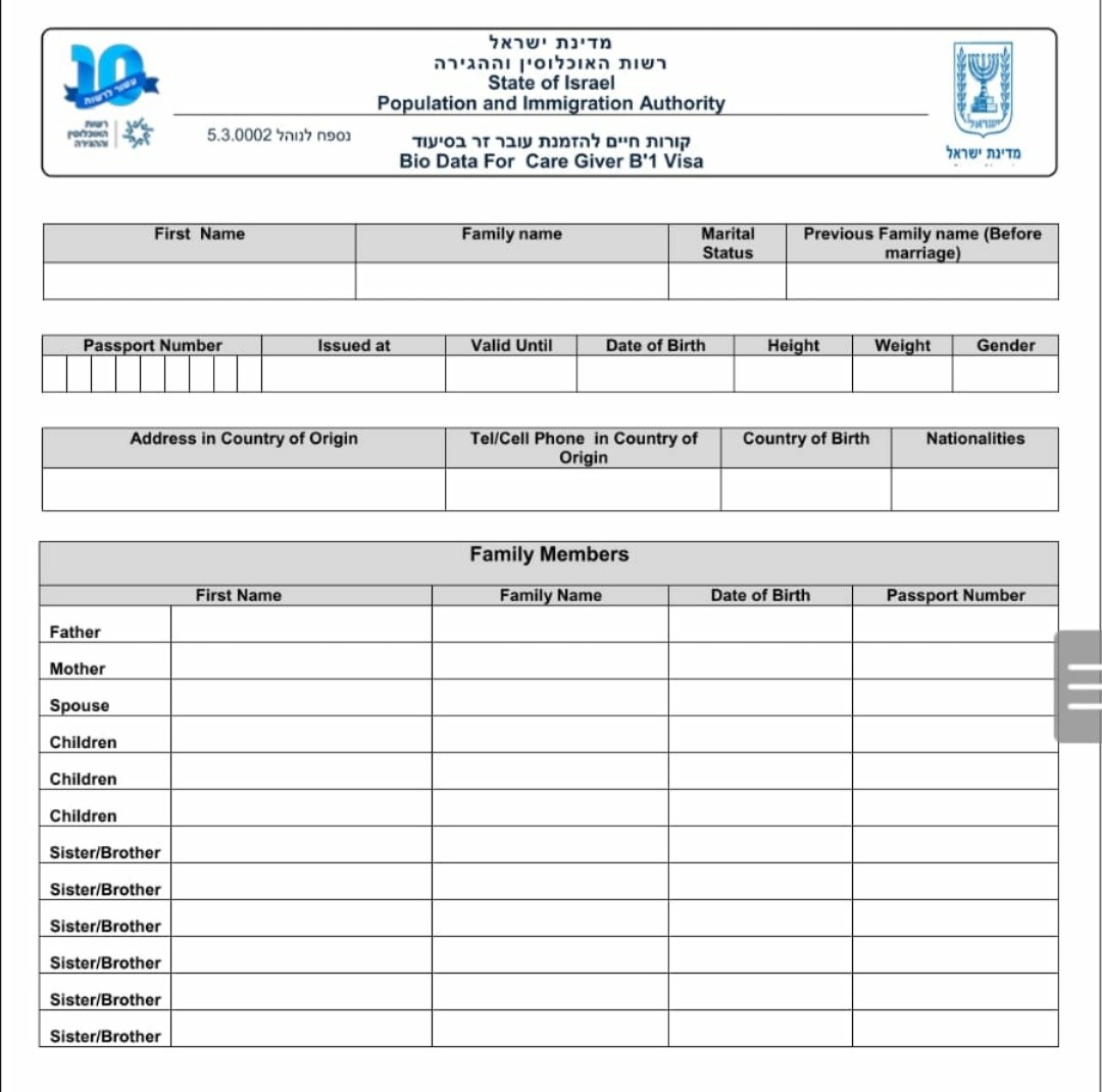 See below the form 5.3.0002 Bio Data For Care Giver B’1 Visa
